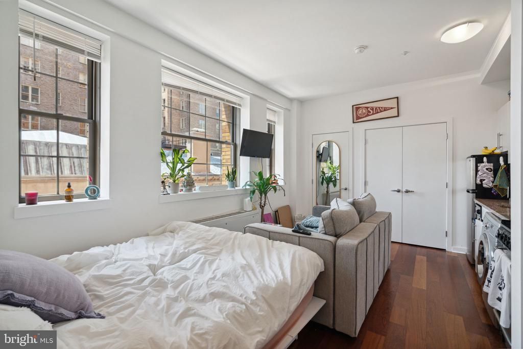 Bright and cheery studio apartment at Parc Rittenhouse on Rittenhouse Square! Enter Unit 411C into an open kitchen with granite countertops, modern cabinetry, stainless steel appliances and a combo washer/dryer. With Brazilian cherry wood floors throughout, the sun-lit living area is filled with natural light from oversized windows. The bathroom is appointed in marble and has a shower/tub. Residents of Parc Rittenhouse enjoy world class amenities and services including a 24 hour doorman; an amenities suite that includes a state-of-the-art fitness center and resident lounge with pantry; media room; outdoor rooftop pool club with a large pool deck, full size pool, kids pool and hot tub; garage parking below the building for an additional fee; and two amazing restaurants on the ground floor, Stephen Starr’s Parc and Via Locusta.