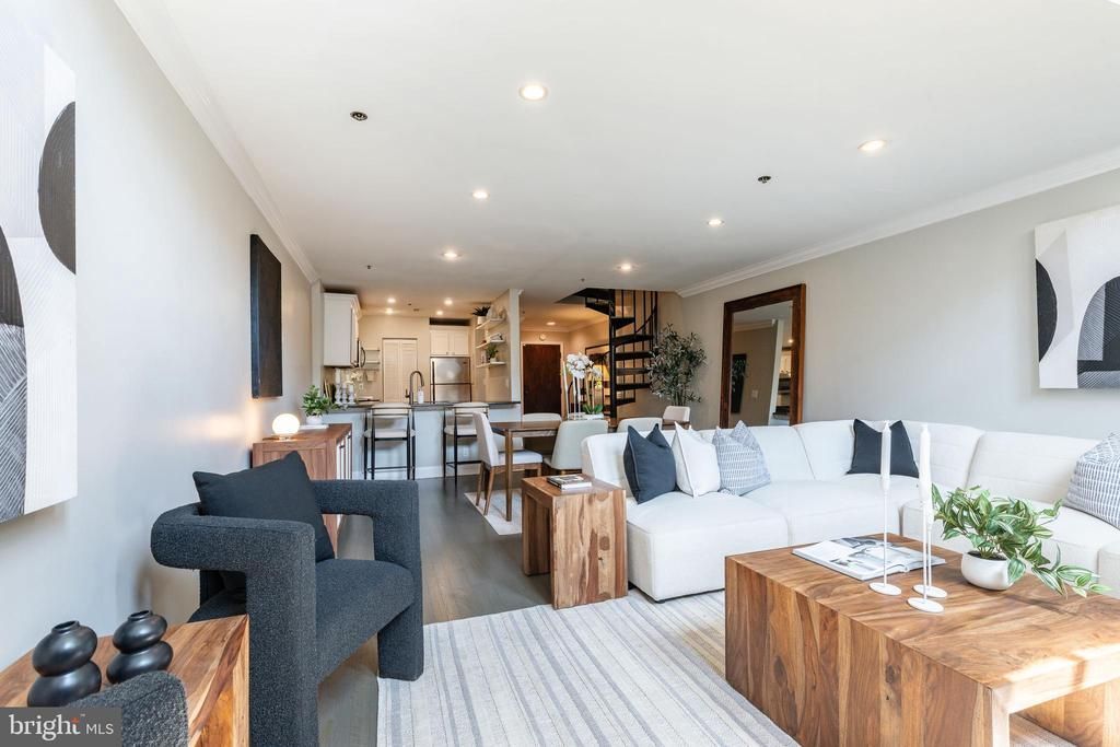 Welcome to Residence #108 at The Carriage House, a historic condominium building in the heart of Fairmount. Enter through a secure vestibule featuring key fob access and a butterfly intercom system, then pass through a stunning European-style atrium with a tranquil fountain that sets the tone for the entire building. Residence 108 is a 2-bedroom, 1-bath bi-level located on the first floor and blends character with modern convenience. Step inside to a welcoming foyer with convenient coat closet storage just off the entry. Beyond, the home opens into a spacious living and dining area highlighted by dramatic ceilings, a spiral staircase, and oversized south-facing windows with electric shades that fill the home with natural light throughout the day. The kitchen features a breakfast bar, stainless steel appliances, and ample counter space. Up the spiral staircase, you’ll find two bedrooms located on opposite sides of the upper level, offering added privacy. The primary bedroom is the lofted space, creating an airy, elevated retreat with great natural light and character. The second bedroom functions comfortably as a full bedroom, and can also be used for guests, a home office, or additional living space. Both bedrooms offer excellent closet space. This floor also includes a full bathroom and an in-unit washer and dryer for ultimate ease. Perfectly positioned right off Fairmont Ave, this home is just steps from Whole Foods, Target, Fairmount Park, The Philadelphia Museum of Art, the Schuylkill River Trail, restaurants, and local shops. Enjoy the best of city living with Center City just a short walk away and easy access to public transportation.